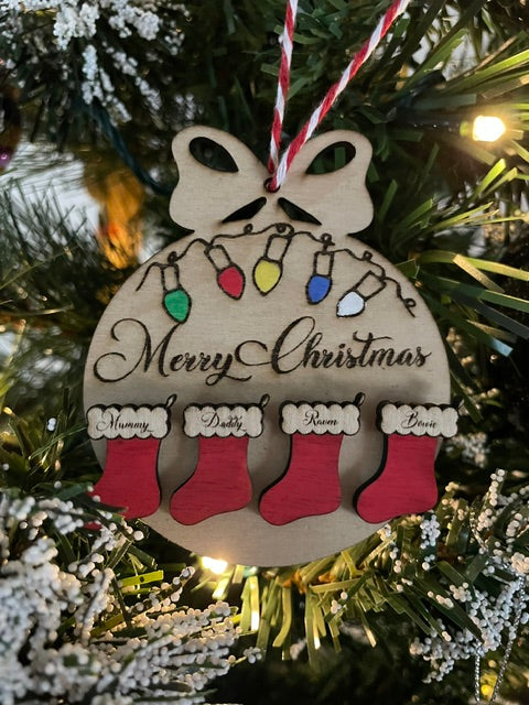 Each wooden decoration is custom made with your family names and 2-5 stockings with names